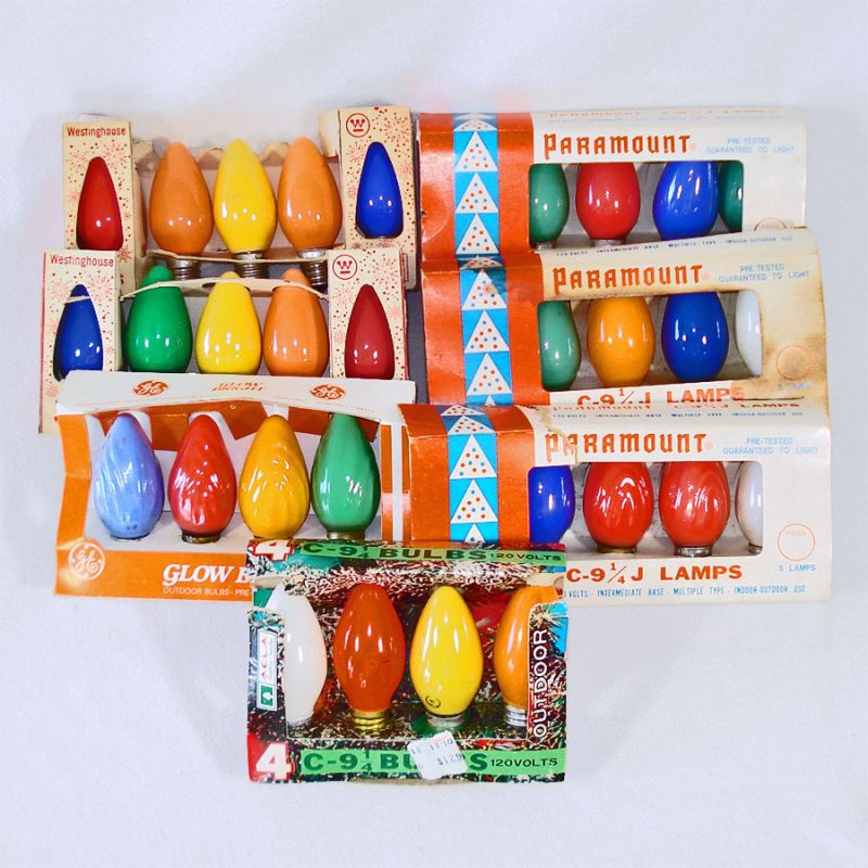 Three working strings of Mid Century Christmas lights, 29 lights in all. They're the larger C-9 size, typically used outdoors, but my parents actually put them on our Christmas tree and in our windows. One strand is an extra long 20 foot Paramount string with 15 sockets spaced about 13-14 inches apart. The other two strings hold 7 lights each, one measuring a little over 10 feet, the other about 12-1/2 feet. Both are Noma, one has a Glolite UL tag (Noma bought Glolite in 1953). The longer 7-light string is older, with 2-part black and red-brown Bakelite sockets marked Noma at the bases.