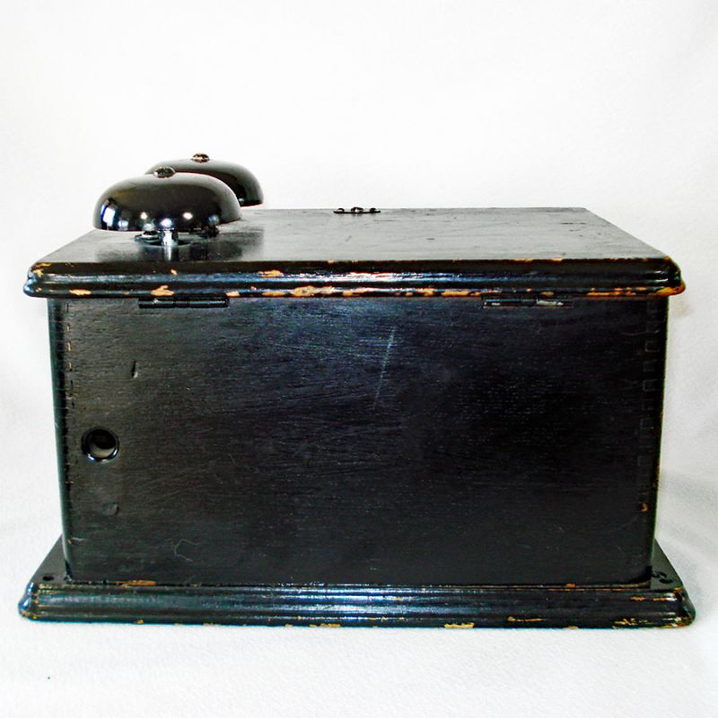 This antique Western Electric ringer box is from the days when telephones had to be wired to a box like this in order to hear it ring when a call came in. It's solid oak, painted black, and quite heavy for its 11 by 8 by 7 inch size - nearly 18 pounds! The interior is very clean and undamaged. The wiring appears to have been restored. The paint has a few nicks as shown, but the wood case is in good shape with no cracks or chips. The only thing missing is the metal crank handle at the side. Carved into the bottom is 400K, presumably the model number.