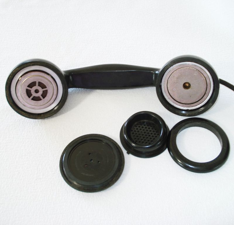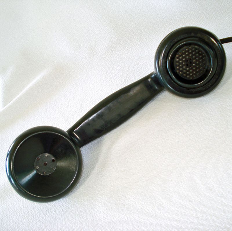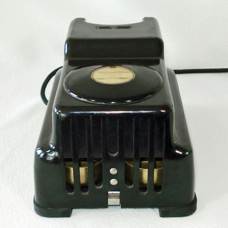 This heavy old Bakelite telephone is the Red Bar Masterphone 1000 by Kellogg. It has no dial and was used primarily in rural areas where a switchboard operate would connect the call once the handset was lifted (in other words, an early party line phone). The company later sold dial mechanisms that could easily be installed in the center. The phone and handset are in very good condition with no cracks or chips. The cloth covered cord has a couple of frays. Apparently my pictures show the phone upside down with the handset in the wrong place. It's supposed to rest on top of the red bar.