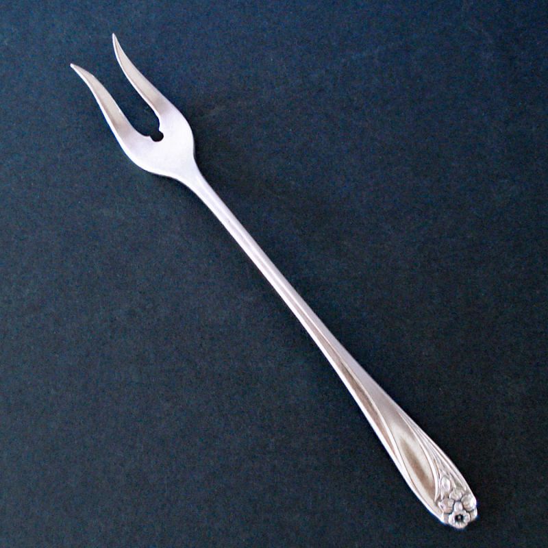 This 6-1/4 inch long silverplated pickle or olive fork is in the Daffodil pattern by Rogers International Silver, first issued in 1950. There are only a very few tiny use or storage marks, no plate loss. Marked on the back 1847 Rogers Bros. IS.