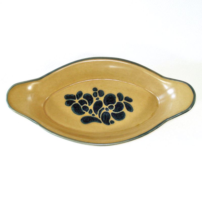 A 22 ounce au gratin baking dish in the popular Folk Art dinnerware pattern, tan with dark blue stenciled flower decoration. It measures 11-3/4 inches long by 6 inches wide and is in excellent vintage condition with no damage. Made in the USA and marked with the older castle logo, the dish can be used in both the oven and microwave.