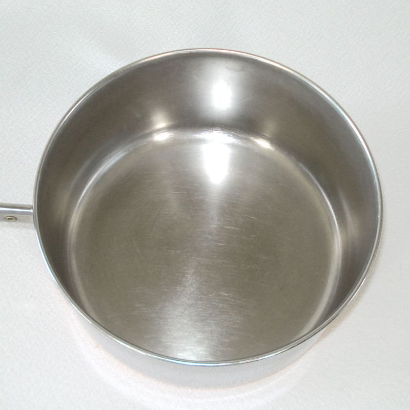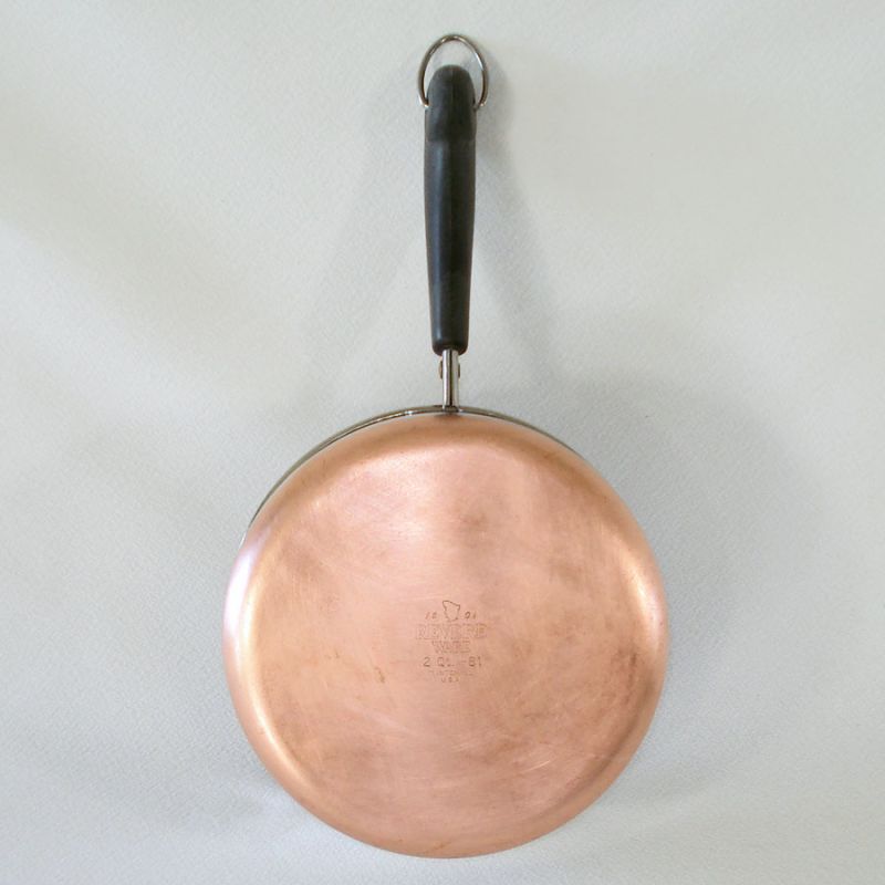 A two quart stainless steel saucepan with copper bottom and lid by Revere Ware. It measures 7-1/4" diameter by 3-1/2 inches deep. The pot is clean and shiny. There are a few faint, hair-fine surface marks to the exterior from cleaning and storage, pretty much a given with stainless cookware. Made in the USA in Revere's Clinton Illinois plant in 1981.