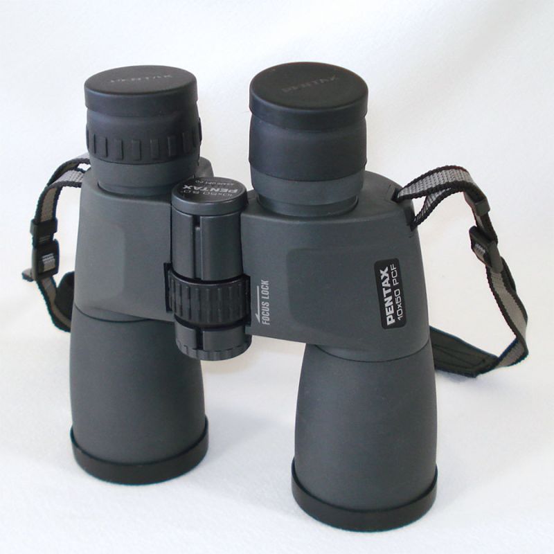 This box of Pentax PCF III binoculars was never opened until I took them out for the pictures. They were purchased by my father in law in 1999 (he paid $180 for them back then) but he never got a chance to use them. The binoculars are 10x50 and come with a soft padded case and neck strap. They're 7-1/2" high by 7 inches wide. The owners manual, dated purchase receipt, and paperwork are present. The original box has minor shelf wear but is intact. The contents are mint and unused.