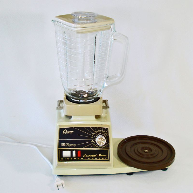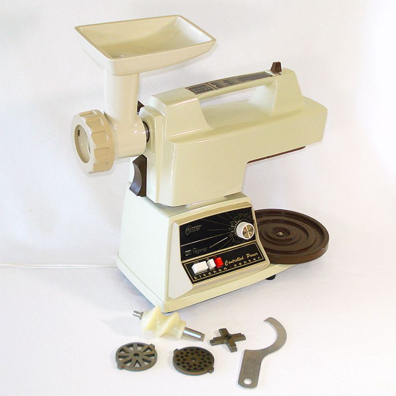 This 1982 almond color Oster Regency 12-speed kitchen center appliance is complete, missing only the original box. Included appliances and accessories are a mixer, blender, food processor, and meat grinder - all tested and working. The mixer accessories include beaters, dough hooks, and two glass mixing bowls. The blender is complete with all parts. The fourth photo shows the food processor with four different slicing/shredding blades among other components. The fifth photo shows how the meat grinder attaches to the end of the detachable mixer unit, only I forgot to turn the mixer around so that the food falls into the mixing bowl (it's designed to operate either way the mixer is turned).