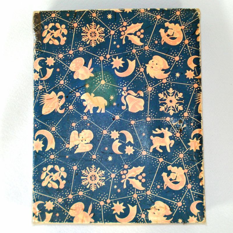 A scarce late 1940s miniature light set made in Italy with 12 clay face pinecone gnomes, dwarfs or elves. Ten are holding a candle topped by a mini light bulb. The elves have white mica snow frosted pine cone bodies, real cotton batting beards, and molded clay-like composition hand painted faces full of character. Each one is different, and each has a different style or color of paper maché composition hat. The hats have wired loops so you can position them with hooks or wire on the tree branches - with wonderful faces like that, you don't want any of them facing the wall or the inside of the tree.