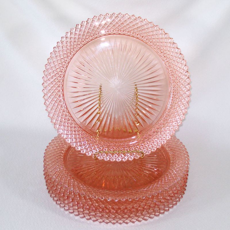 A set of six 10-1/4 inch pink depression glass dinner plates in the Miss America pattern by Anchor Hocking. All but one are in very good condition with no chips or flakes, only a few shallow utensil marks in the centers. One plate has a tiny nick to the tip of one of the edge points. Price is for the set of six plates.