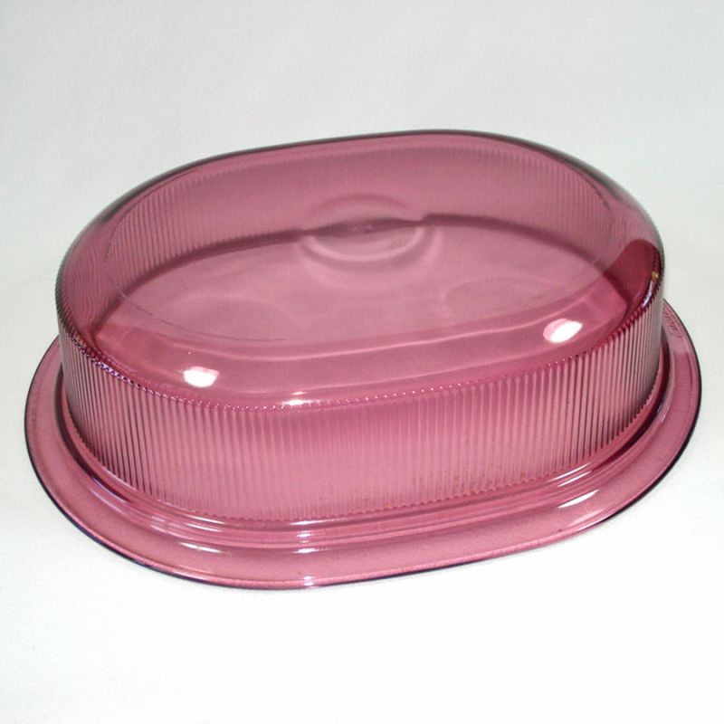 This is the Corning Visions 4 quart covered oval roasting pan in transparent Cranberry colored glass. It measures 14-1/2 by 11-1/2 inches and is 3-3/4 inches high to the rim. It's in excellent, clean condition with no damage, just some very light rub wear on the bottom from storage and contact with oven racks. Marked on the bottom Vision, 4 Qt, V-34-B, 4L, Corning USA. Visions Cranberry was produced from 1992 to the early 2000s.