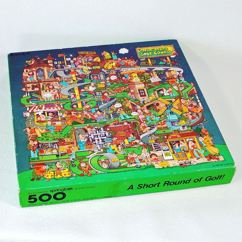 This Springbok jigsaw puzzle from 1985 is titled A Short Round of Golf, number PZL2205, designed and illustrated by Robert Blair (Bob) Martin. It features a busy and amusing cartoon illustration of a Rube Goldberg style miniature golf course. The completed size is 20 by 20 inches. The puzzle has been worked and is guaranteed complete. The box is intact with no splits or tears but the previous owner's name is written at one corner of the lid and there some storage wear around the edges and bottom.