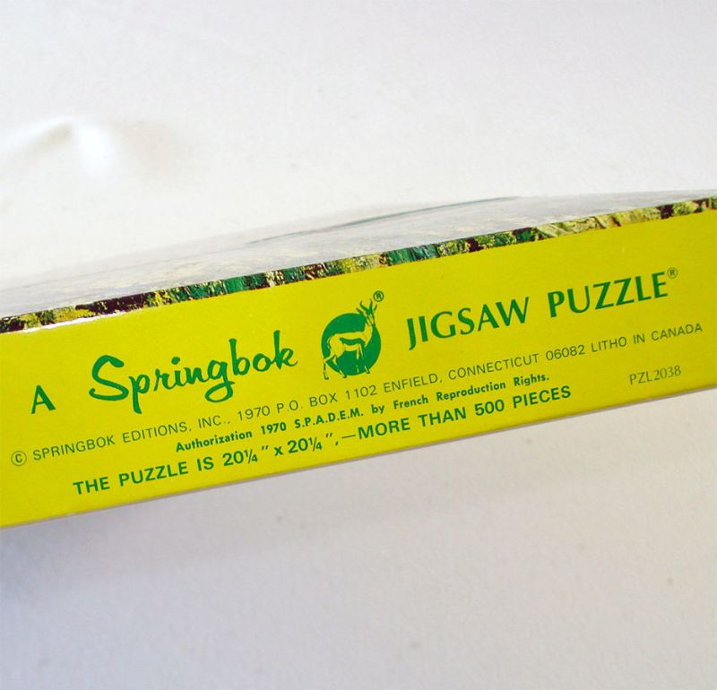This 1970 original Springbok Editions (produced before Hallmark purchased the company) 500 piece jigsaw puzzle is part of a series depicting famous fine art museum paintings. It's titled Pond With Waterlilies. It depicts Claude Monet's circa 1899 impressionist painting of the water garden he designed on his property outside of Paris. The puzzle has been worked and is guaranteed complete. The old style, thick green-backed pieces fit perfectly and are in good condition. There's some clear tape across the box lid and some very light storage wear around the edges, otherwise the box is intact and in good condition.