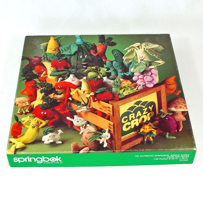 This 1985 Springbok 500 piece jigsaw puzzle is titled Crazy Crop. It features a photographic arrangement of parent company Hallmark's short-lived line of soft sculptured anthropomorphic fruit and vegetable figures or dolls. The finished puzzle measures 20 inches square. It has been worked and is guaranteed complete. The box is intact with no splits or damage, just some very slight wear along the lid edges.