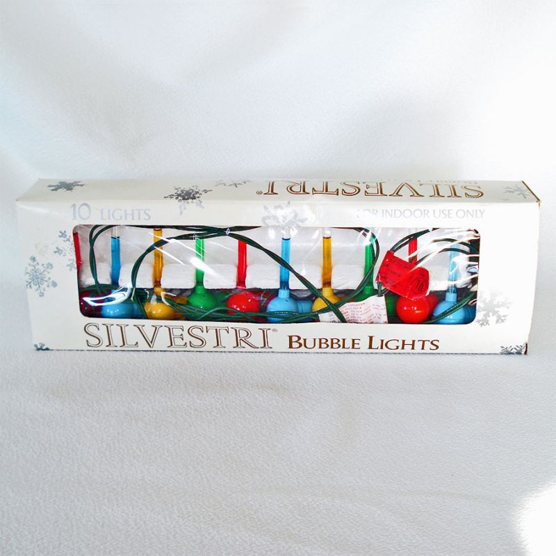 This scarce box of bubbling Christmas lights by Silvestri is from the 1970s, maybe early 1980s. They're more petite than the original 1950s bubble lights, 3 inches high with slender glass tubes and solid colored plastic ball bases with branch clips. There are ten lights on the string, placed about 9 inches apart. I estimate the total string length to be between 10 and 11 feet. The lights all work fine as shown and they do bubble - I just didn't wait long enough before snapping the last picture.