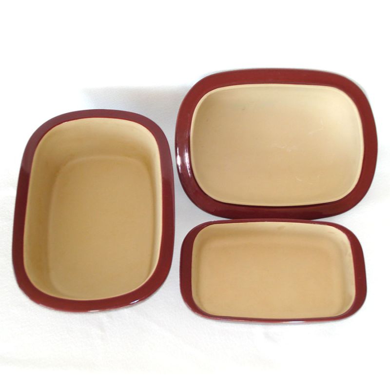 The brown exterior glaze on both bakers is clean and shiny with no damage. The unglazed interiors have some very light cooking stains. They're so minimal I'm sure neither pan was used more than once or twice. The company's website has instructions for cleaning the unglazed stoneware with a baking soda paste. I tried it and it did lighten the stains considerably, but they could use one more treatment. There are no cracks, chips, or fleabites to any of the three pieces.