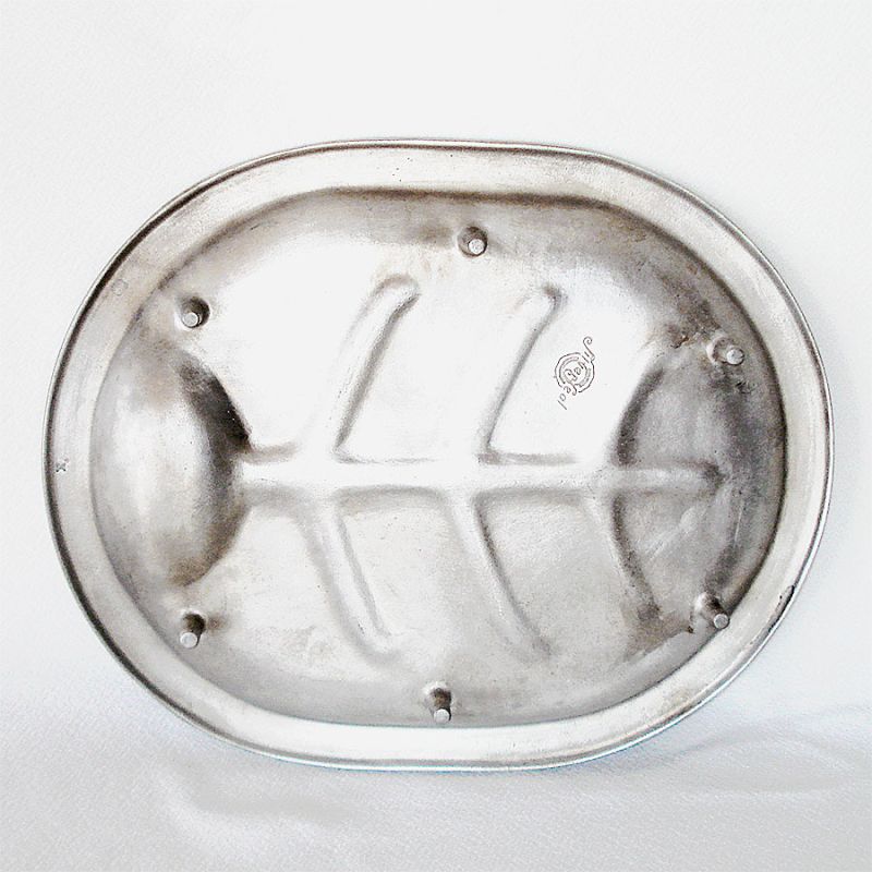 This attractive well-and-tree footed meat platter, however, did not survive the change over and was never made in the Guardian line. It measures 13-3/4 by 11 inches and rests on six molded feet. It's in excellent, shiny condition, with only minor, very shallow utensil scratches. Poor lighting on a sunless day caused the dark shadows in the pictures.