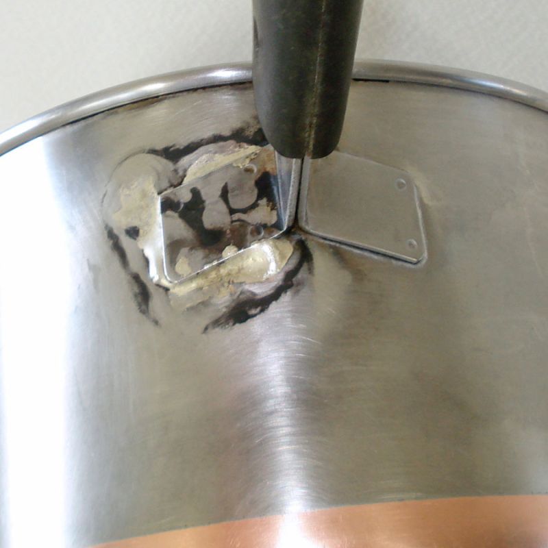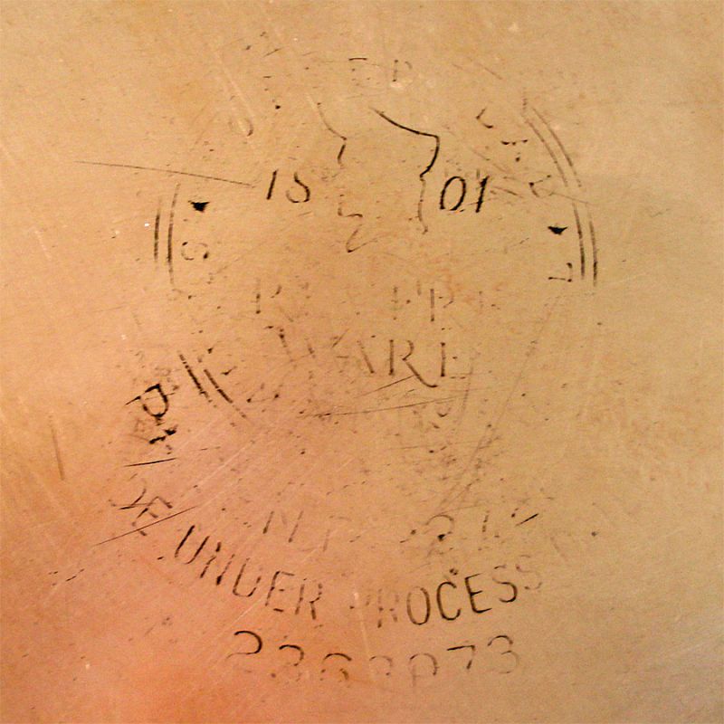 This is a vintage American made 3 quart Revere Ware copper bottom stainless steel saucepan, 5-1/4 inches deep by 7-3/8 inches diameter. The pot has a nice, substantial weight with the original Process Patent mark on the bottom. It's an earlier version, one-half inch taller than the 3 quart saucepans made after 1958. The stainless steel finish and copper bottom are clean and shiny. However, one side of the handle has been re-welded. It's just cosmetic and doesn't affect cooking performance, but the repair is reflected in the price.