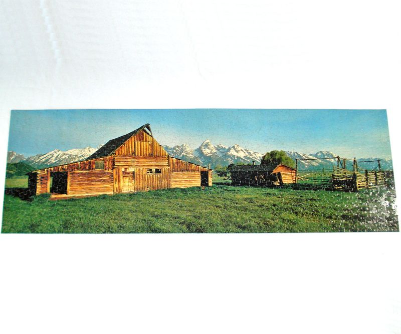 This Springbok 700-plus piece Panoramic jigsaw puzzle is from 1985. Titled Home Sweet Homestead, it features a dilapidated old wooden barn scene near Jackson Hole Wyoming, with a sweeping view of the Teton mountains in the background. The puzzle measures 13 by 40 inches assembled. It has been worked and is guaranteed complete. The box has minor storage wear around the lid edges, no splits or tears.