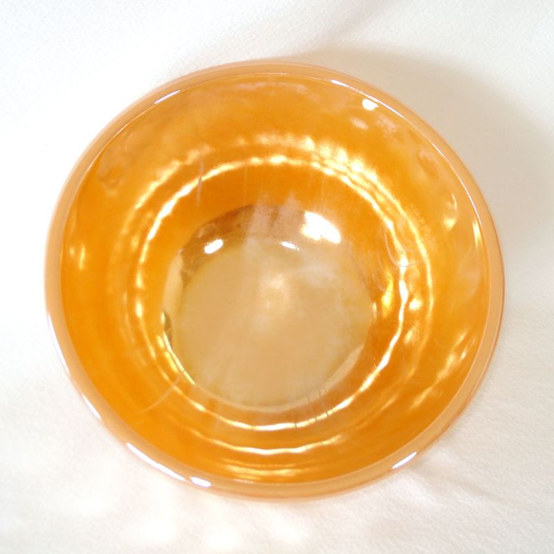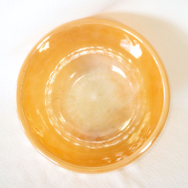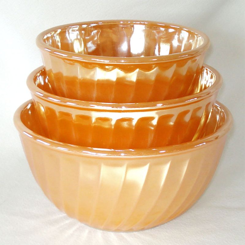 A set of three Anchor Hocking Fire King nested glass mixing bowls in their Mid Century swirl pattern with iridescent Peach Lustre finish. Sizes are 9, 8, and 7 inches diameter with depths of 4-1/2 to 3 inches. The bowls are about 70 years old or more. They have no chips, flakes, or cracks/hairlines but the lower interiors have stir marks and loss of color. Especially the small bowl, it's lost most of the peach finish down to the white glass in the bottom third. The exteriors however are in much better condition with the finish mostly intact and glossy, all very displayable and usable. Note: this bowl set never came in sets of four - only White and Jadeite swirl had the small 5 inch bowls available.