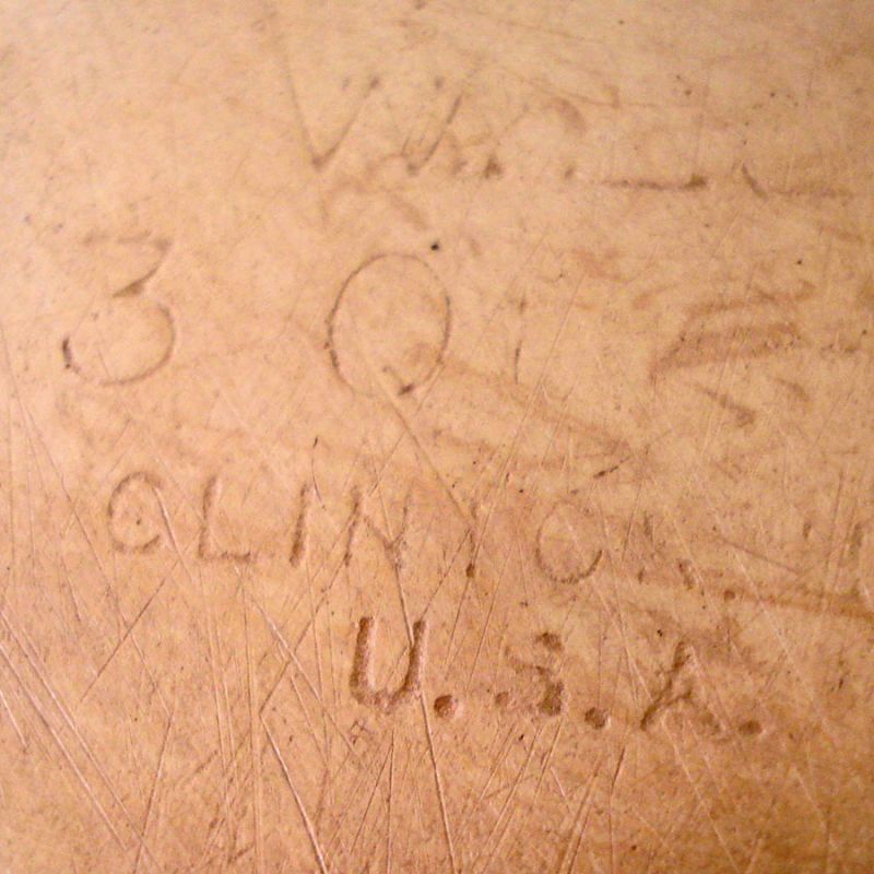Vintage Revere Ware copper bottom stainless steel saucepan, 4-3/4 inches deep by 7-3/8 inches diameter. It holds 3 quarts to the rim. The stainless steel finish is shiny and clean with a few minor surface marks from cleaning and storage. The copper bottom has been polished. There's some color fading to the phenolic black handle and lid knob from dishwasher use but they're both sturdy and intact. The lid has more storage wear including a couple of shallow, faint dings. The mark on the bottom of the pan is faint but it was made in the Clinton Illinois plant between 1974 and 1977, based on the 1801 mark and lack of production date.