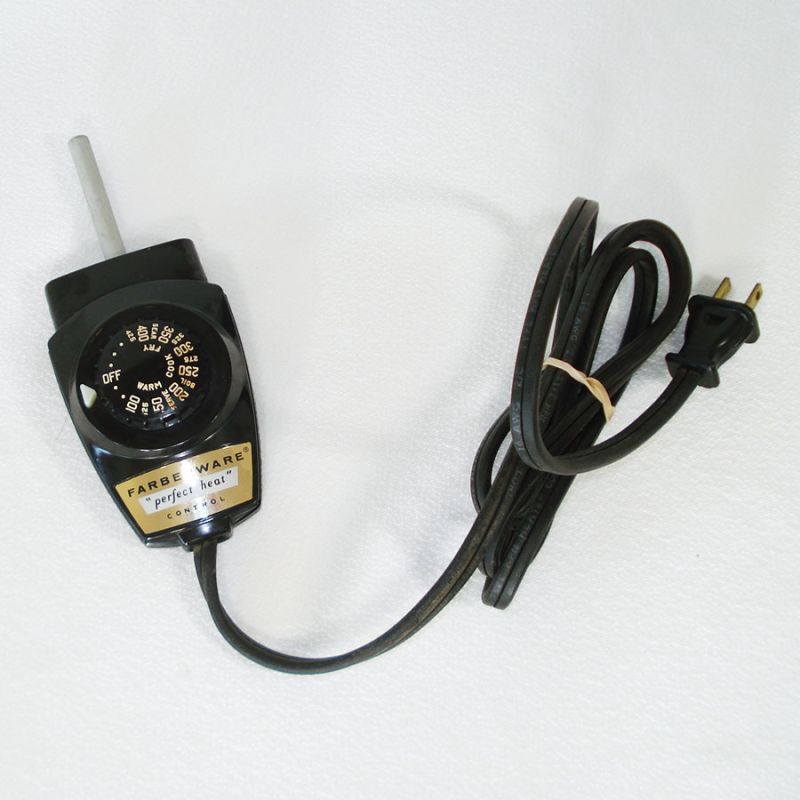A model 100 replacement heat control for the Farberware electric skillet fry pans. It's vintage, from the 1960s through 1980s. The cord is 4-1/2 feet long. It's in excellent working condition with no damage. The red indicator lights up properly as shown.