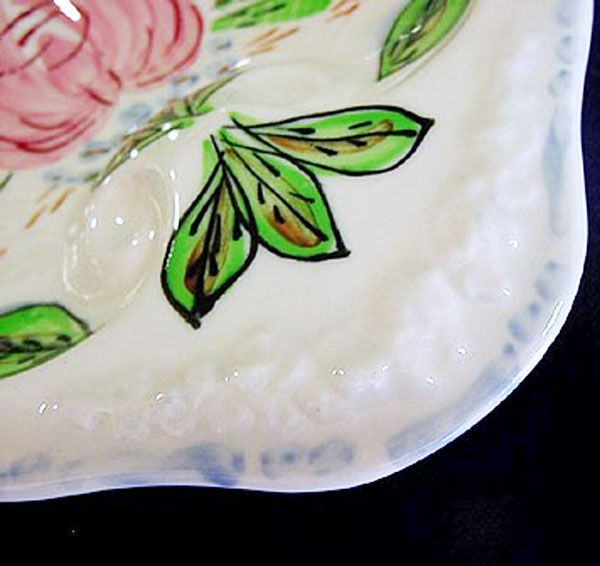 The bowl measures a little over 9" by 9" and is 1-3/4" deep. The underside rim edge has 3 tiny chips, oddly all of them appear to be underglaze, having occurred during manufacture. You cannot see the chips from the side or top, you have to turn the bowl over, and even them you'll feel them before you see them as they're glazed and color consistent with the porcelain body. I've shown an enlarged, sharpened picture of the two largest. Otherwise the dish is in excellent condition, no scratches, crazing, or other problems. The underside is marked "Blue Ridge China, Hand Painted Underglaze, Southern Potteries Inc. Made In U.S.A."