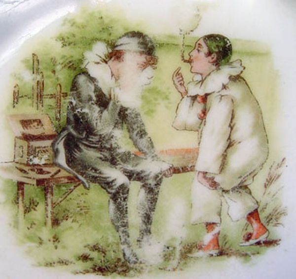 Early juvenile feeding dishes often had an educational or even disciplinary theme, sometimes stern, sometimes amusing. This Bavaria porcelain baby plate depicts a pair of young Pierrots trying to smoke cigars. Unfortunately there is wear to one of the faces, but it's obvious that the smoke is making one boy cough or feel ill, and the other seems to be trying to show him the proper technique (or possibly taunting the reluctant Pierrot). A box of cigars is spilling out on the bench beside them. The words Baby's Plate appear underneath the scene, but the words are badly faded. It's an unusual theme for a child's dish.