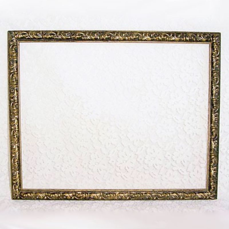 This vintage wooden picture frame is 7/8" wide. It will take a picture or painting that is 14 by 11 inches or just a shade bigger. The overall dimensions are 15-3/8" by 12-3/8". The carved scroll work molding is finished in antiqued gold (gold rubbed over black). One outside corner has a scratch to the finish.
