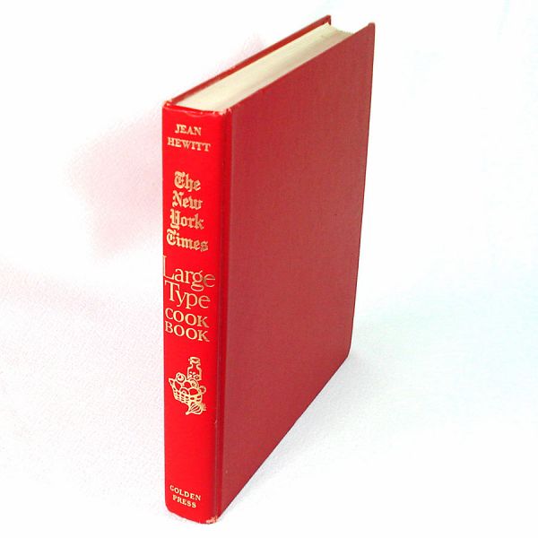 The New York Times Large Type Cook Book by Jean Hewitt, Published by Golden Press New York, Copyright 1968, unstated first edition. This indexed, 446 page cookbook has nice, large, dark print and is perfect for those who have to keep their reading glasses handy when they cook, or for anyone who has messed up a recipe by mis-reading small type and used the wrong measurements.