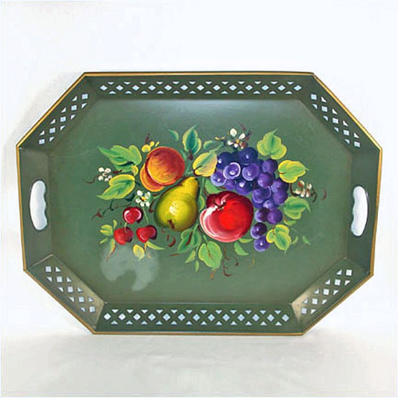 A large Mid Century reticulated hand painted tole tray by Nashco New York. It has a hand painted fruit and flowers still life in the center on a dark green background. The tray measures a generous 20 by 15 inches and has cut-out side handles and reticulated lattice sides. Original Nashco foil label is present on the back. The only wear of any note is a faded spot in one corner near the cherries, probably from spilled liquid. There are some minor, light scratches, mostly to the back, nothing noticeable on the front.