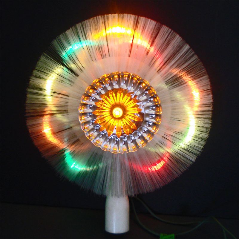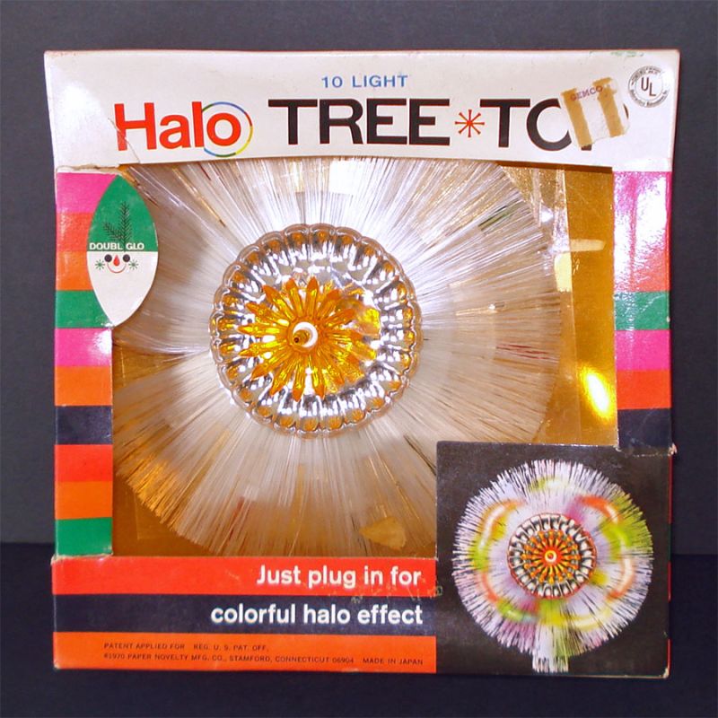This colorful Mid Century lighted electric Christmas tree top is a rosette halo of fiber optic strands with a circle of ten colored lights behind it. The strands are plastic but look like spun glass. It's about 6-3/4 inches diameter and in excellent working condition. The original box has some storage wear and is missing the cellophane window. Made in Japan for Doubl-Glo Paper Novelty in 1970.
