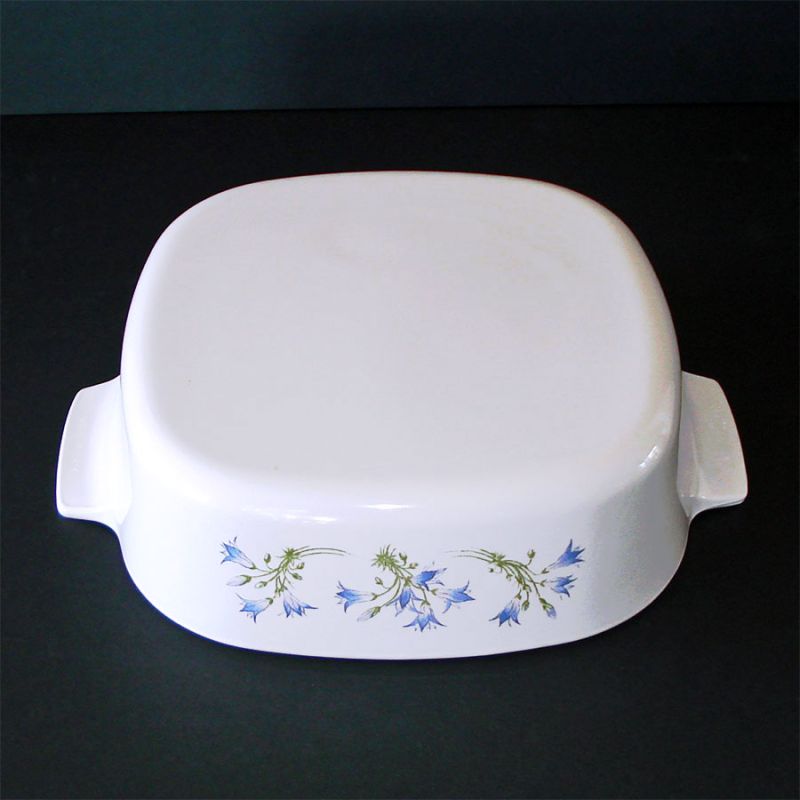 The Blue Dusk Corning Ware pattern was so pretty, it's surprising that it was only made for such a short time, between 1994 and 1997. This is the 2 liter/quart casserole baking dish in Blue Dusk, with delicate bluebell flowers and green leaves decoration on both sides. It's 8-1/2 by 10-1/4 inches across the tab handles by 2-5/8" deep. It looks like it was never used, with glaze and decoration fully intact. There are no stains, scratches, damage, or wear. The glass lid has a smooth, tiny fleabite flake on the inner lip, probably from storage. Otherwise it's crystal clear and in excellent condition.