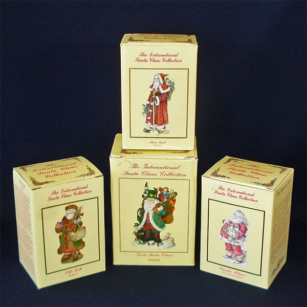 A set of four poly resin Christmas figurines in the International Santa Claus collection, mint in their original boxes and dated from 1993 to 2002. Included are: