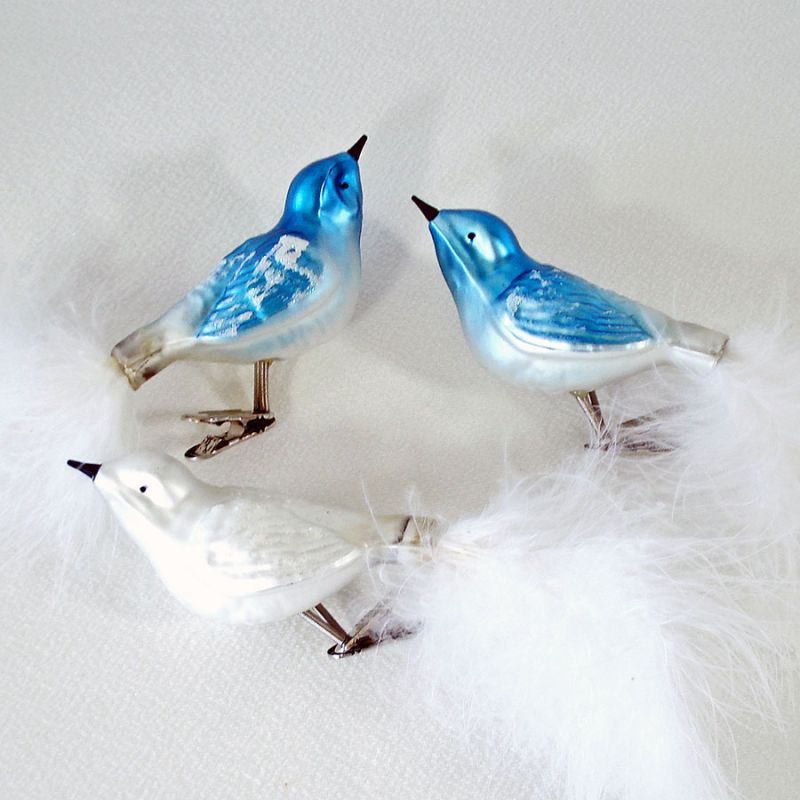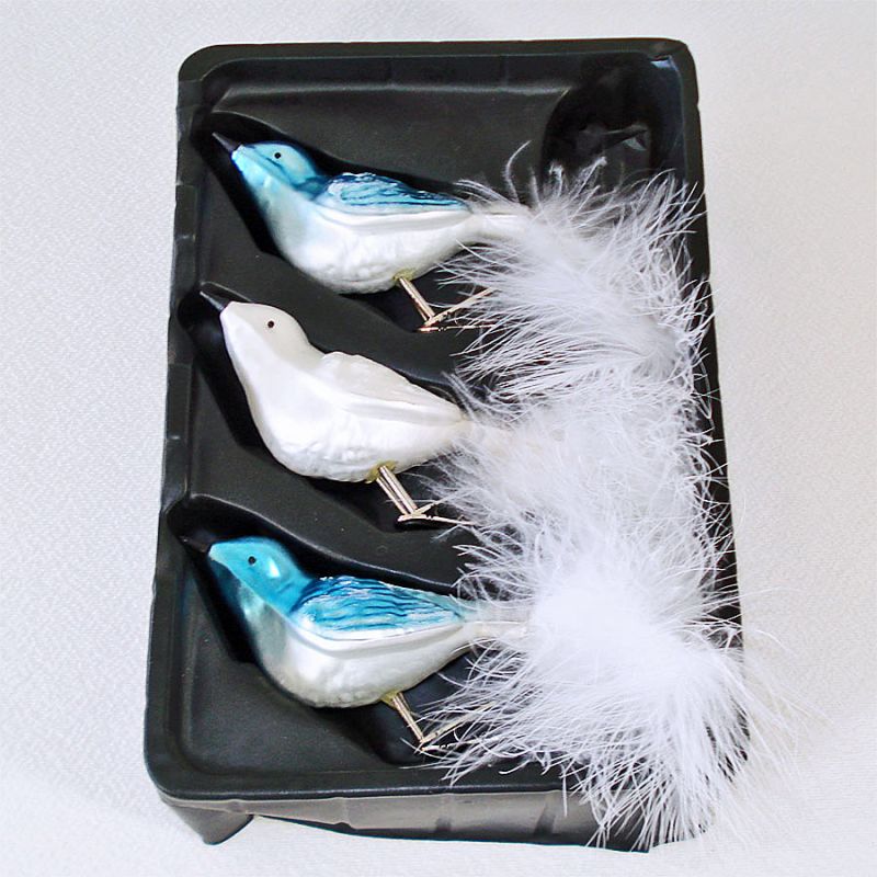 A set of three pretty silvered mold-blown glass clip-on bird Christmas ornaments in blue and white. They're about 4 inches long, not including the white feather tails. The wings are dusted with white and opalescent glitter to catch the light. All three ornaments are in excellent condition with no damage. The double spring clips work properly.