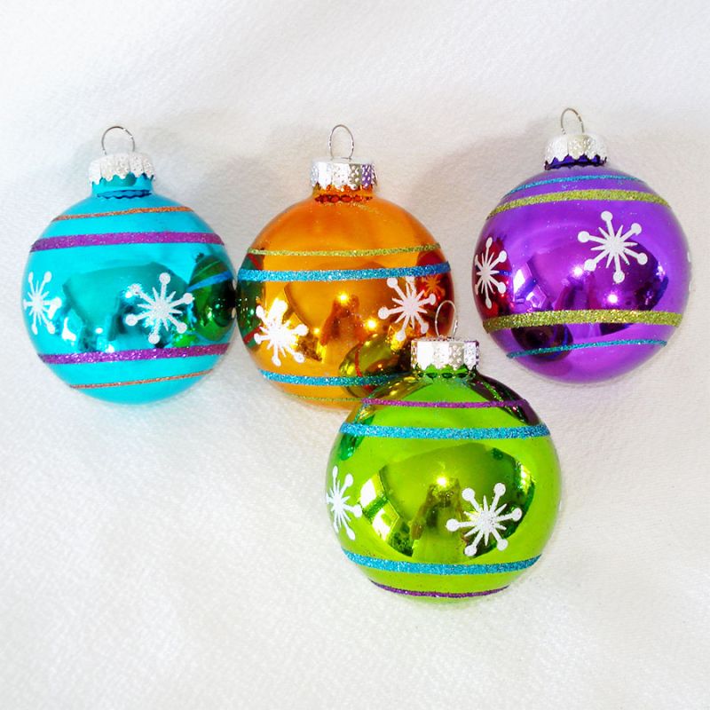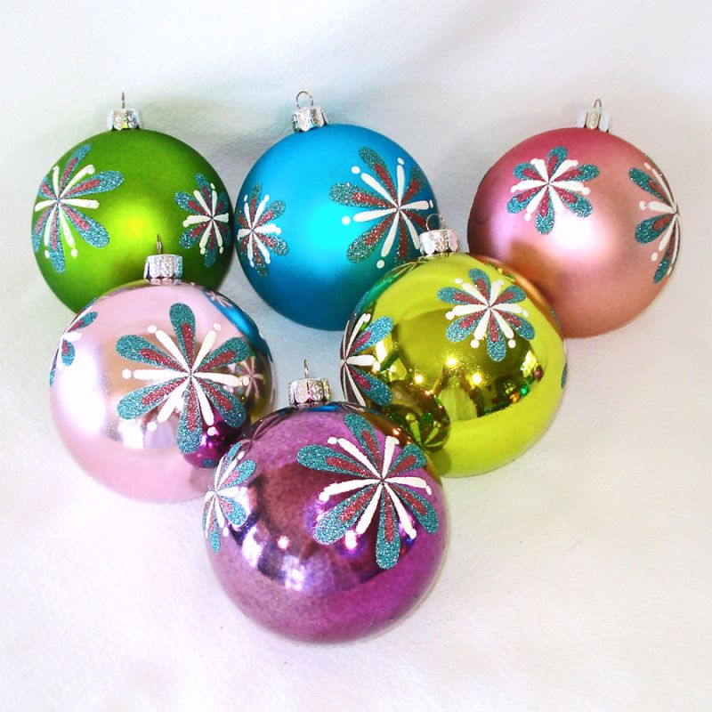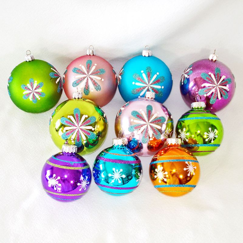 An assortment of ten silvered glass Christmas ornaments in bold, vivid colors, decorated retro style with colored glittered starburst flowers and snowflakes. Six are 3-1/4 inches diameter, encircled with alternating big and small flowers in blue, pink, and white glitter. The four smaller ornaments are about 2-3/4" diameter with white glitter starburst snowflakes around the centers, and brightly colored glitter rings above and below. The ornaments date to the early 2000s and are in excellent vintage condition with no damage or finish loss.