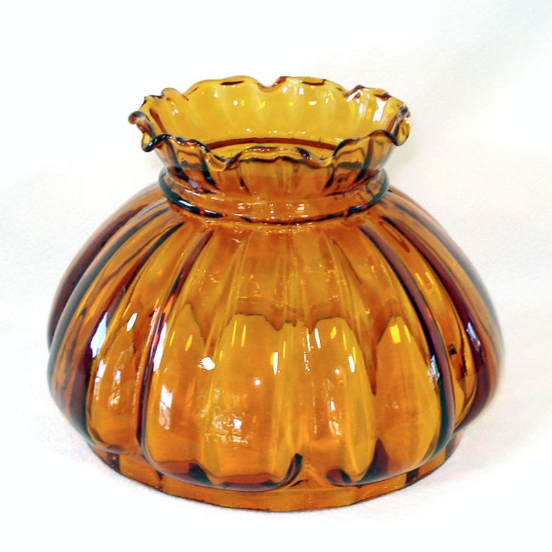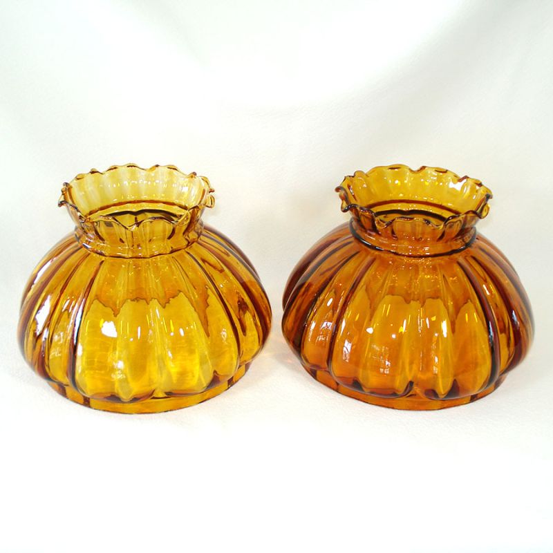 I have two of these amber melon rib blown glass shades, suitable for pole, student, or table lamps. They're Fenton style (not necessarily Fenton - I don't know who made them), with vertical melon ribbed bodies and crimped ruffled rims. They are 7 inches diameter across the fitter bottoms by 6" high. Both are in excellent vintage condition with no damage, scratches, or cloudiness. One is a little darker than the other as shown in the last picture. Be sure to specify if you have a preference.