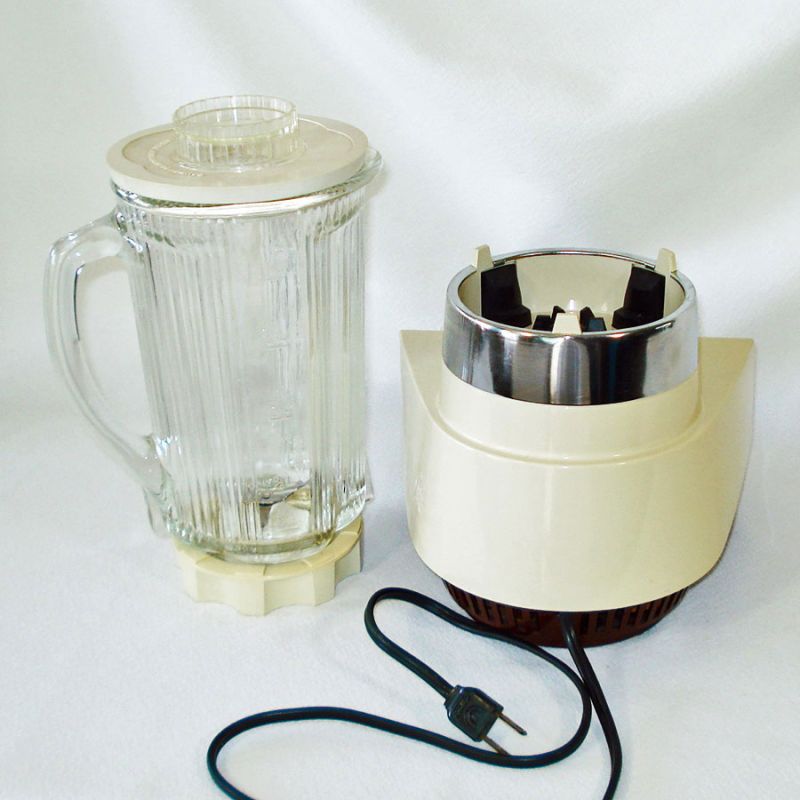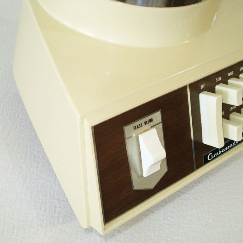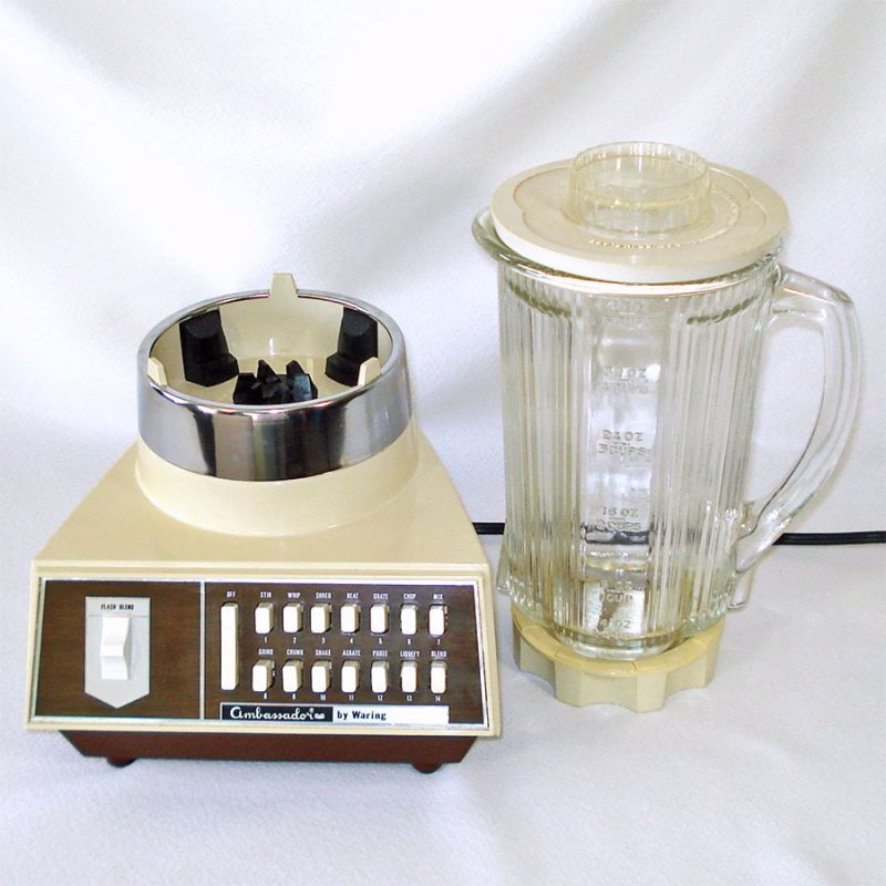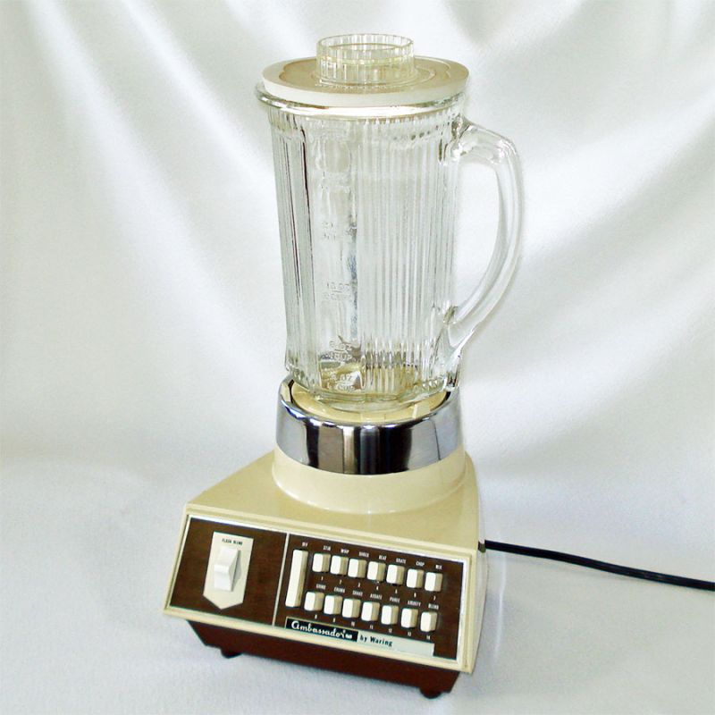 This 1970s almond color kitchen appliance is the Ambassador 14 speed food blender by Waring. It has 14 speeds plus a "flash blend" button. The glass jar holds 40 ounces (5 cups). It works well and is super clean for a 50 year old kitchen appliance. No dents, dings, or damage.
