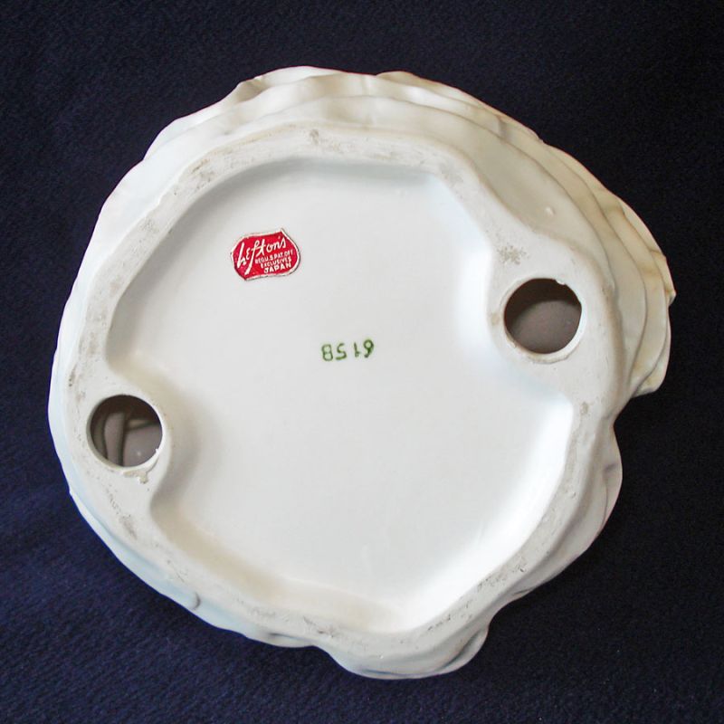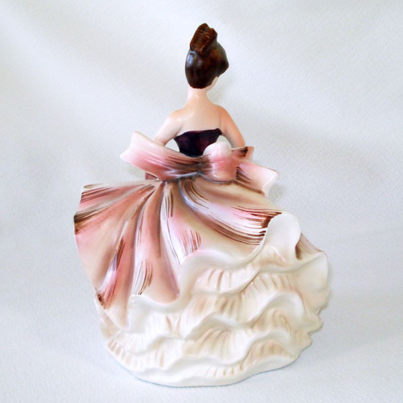 A lovely 1950s porcelain dancing elegant lady figurine from Lefton. She's a little over 8 inches high (large for a Lefton figure) with brown upswept hair. She wears a sleeveless plum colored bodice and full swirling mauve gown with applied flowers and leaves over ruffled petticoats. This figurine was also made as a planter. Marked with the stock number 615B and foil Lefton's Exclusives Japan label on the bottom. In excellent vintage condition with no damage.