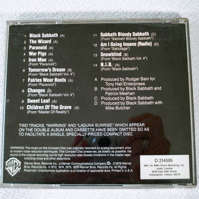 Black Sabbath We Sold Our Soul For Rock and Roll classic rock used compact disc. BMG Music / Warner Bros Records. Copyright 1976, this version released in 1990. Photos are of the actual item for sale, not stock pictures. Clean disc, no scratches or scuffs. Tested, all songs play well. No cracks to case.