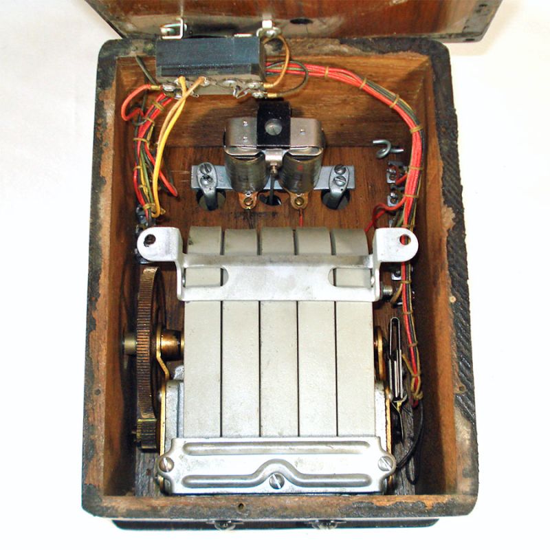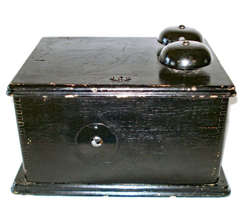 This antique Western Electric ringer box is from the days when telephones had to be wired to a box like this in order to hear it ring when a call came in. It's solid oak, painted black, and quite heavy for its 11 by 8 by 7 inch size - nearly 18 pounds! The interior is very clean and undamaged. The wiring appears to have been restored. The paint has a few nicks as shown, but the wood case is in good shape with no cracks or chips. The only thing missing is the metal crank handle at the side. Carved into the bottom is 400K, presumably the model number.