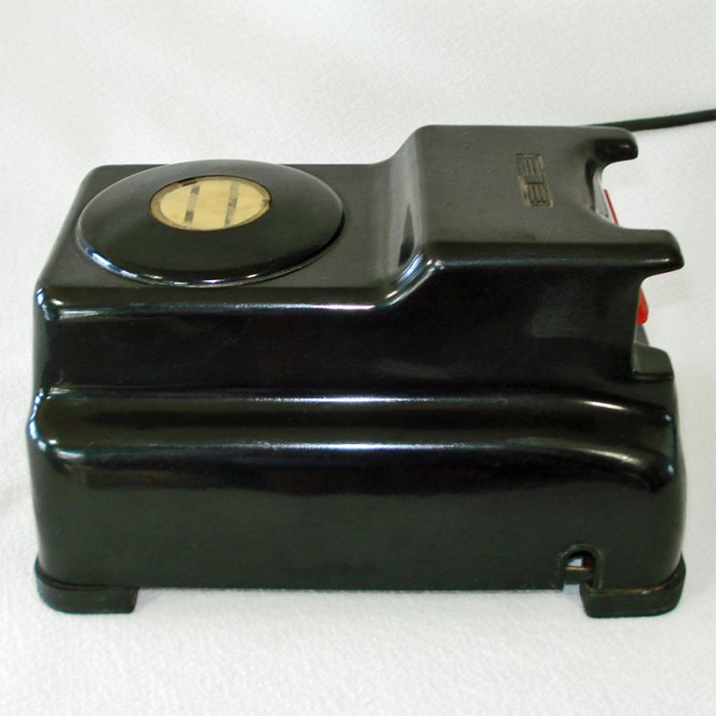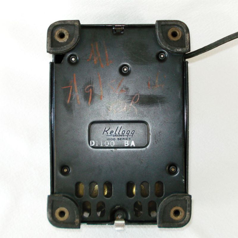 This heavy old Bakelite telephone is the Red Bar Masterphone 1000 by Kellogg. It has no dial and was used primarily in rural areas where a switchboard operate would connect the call once the handset was lifted (in other words, an early party line phone). The company later sold dial mechanisms that could easily be installed in the center. The phone and handset are in very good condition with no cracks or chips. The cloth covered cord has a couple of frays. Apparently my pictures show the phone upside down with the handset in the wrong place. It's supposed to rest on top of the red bar.