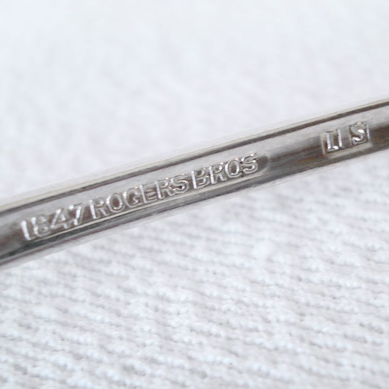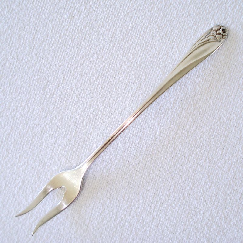 This 6-1/4 inch long silverplated pickle or olive fork is in the Daffodil pattern by Rogers International Silver, first issued in 1950. There are only a very few tiny use or storage marks, no plate loss. Marked on the back 1847 Rogers Bros. IS.