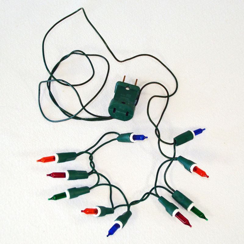 This working 10-light General Electric miniature light string is for the 1960s - 1970s GE Merry Midget tree toppers, both the gold tinsel star and the Rainbow fiber optic style (10-lite toppers only). The string is in excellent working condition with no damage or wear. Total length not including the plug is about 32 inches. Bulbs are placed an inch or so apart.
