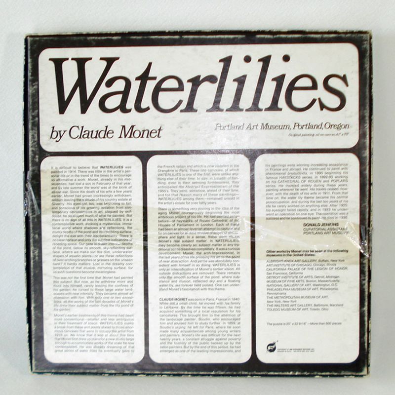 This 1968 original Springbok Editions (pre-Hallmark) 500 piece jigsaw puzzle is part of a series depicting famous fine art museum paintings. Number PZL2014, titled Waterlilies, depicts Claude Monet's 1914 impressionist painting. Completed size is about 20 by 23 inches. The puzzle has been worked and is guaranteed complete. The box has some storage wear around the edges was sealed with clear tape but is intact with no splits or tears.