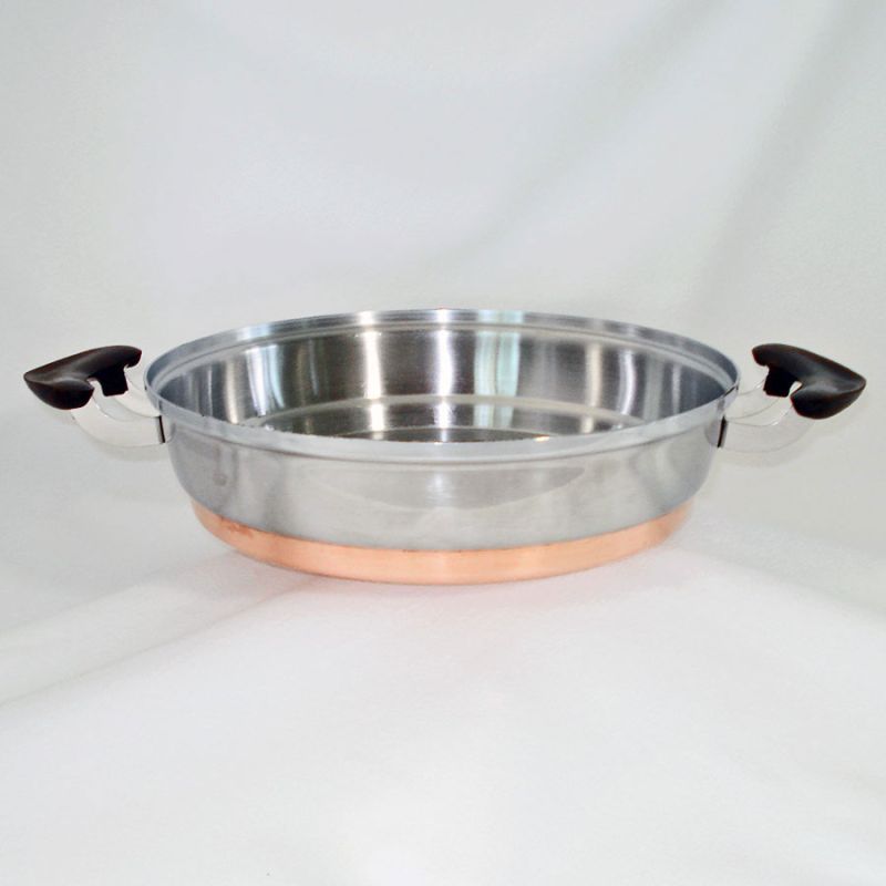 This 10-1/2 inch diameter by 2-1/2" deep 1950s skillet was made by Presto to compete with Revere Ware. Like Revere, Presto Pride cookware was stainless steel with copper bottoms. The similarities end there though. Presto used much heavier and thicker stainless, and it had a more modernist design with mottled brown Bakelite or phenolic boomerang double handles.