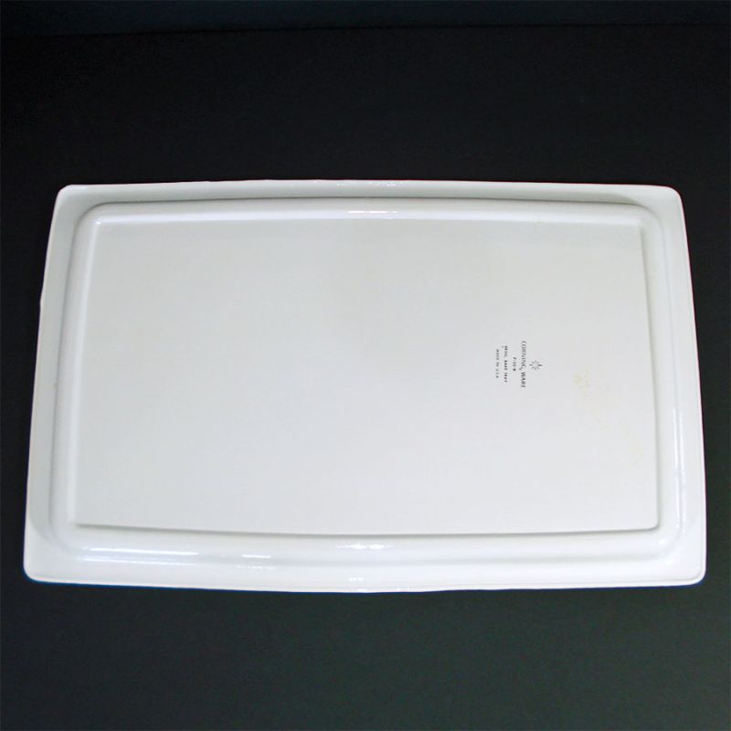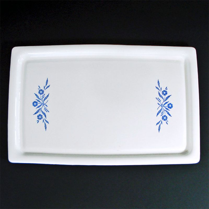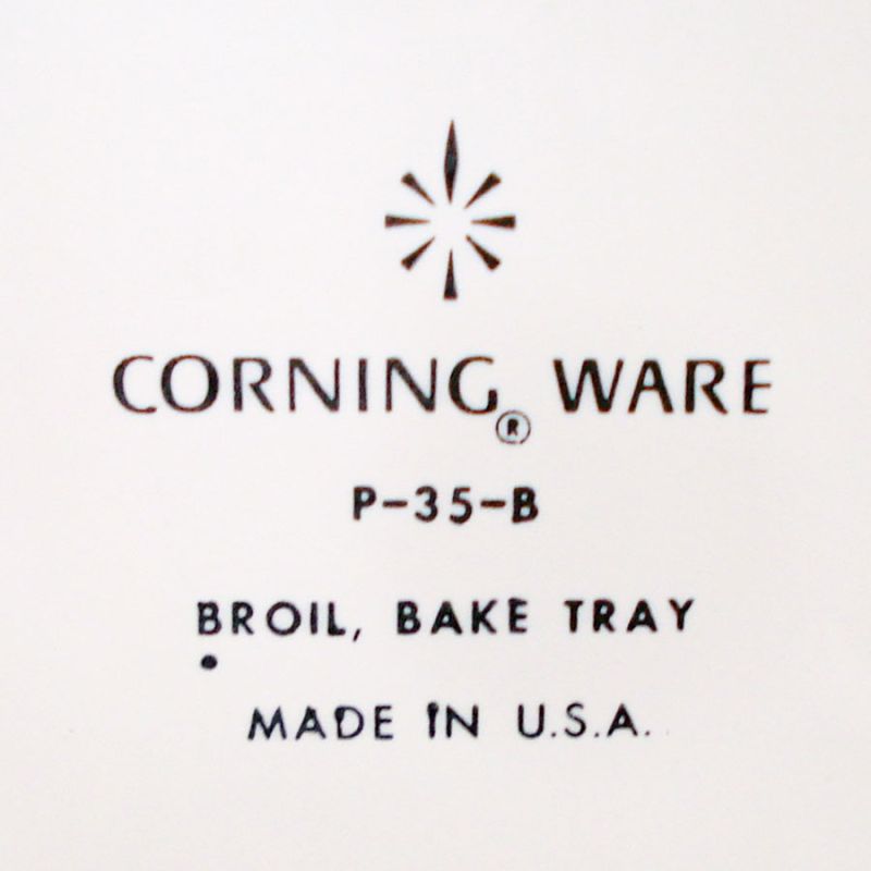This versatile 1960s Cornflower Blue broiler tray by Corning Ware can be used as a broiling pan, a meat or carving platter, a baking or cookie sheet, an underliner to catch spills when baking pies & such, or as a serving tray. It measures 16 by 10-1/4 inches and is marked "Corning Ware P-35-B, Broil, Bake Tray, Made In USA". The tray looks barely used, if that. It's in excellent, spotlessly clean condition with no chips, flakes, scratches, stains, or cooking gunk.