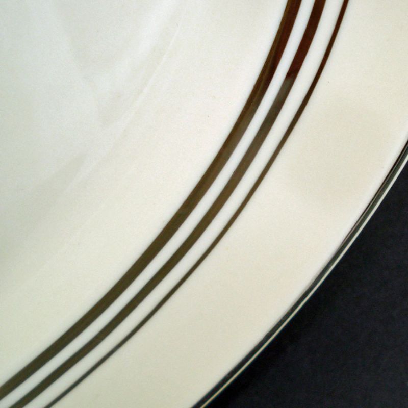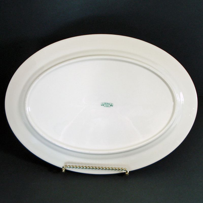 The 16 by 11-3/4 inch platter has a simple decoration consisting of concentric platinum rings or bands on creamy ivory. When tilted into good light, there are a very few short, shallow utensil marks to the center glaze only. Otherwise the platter is in excellent condition with no damage or platinum wear.