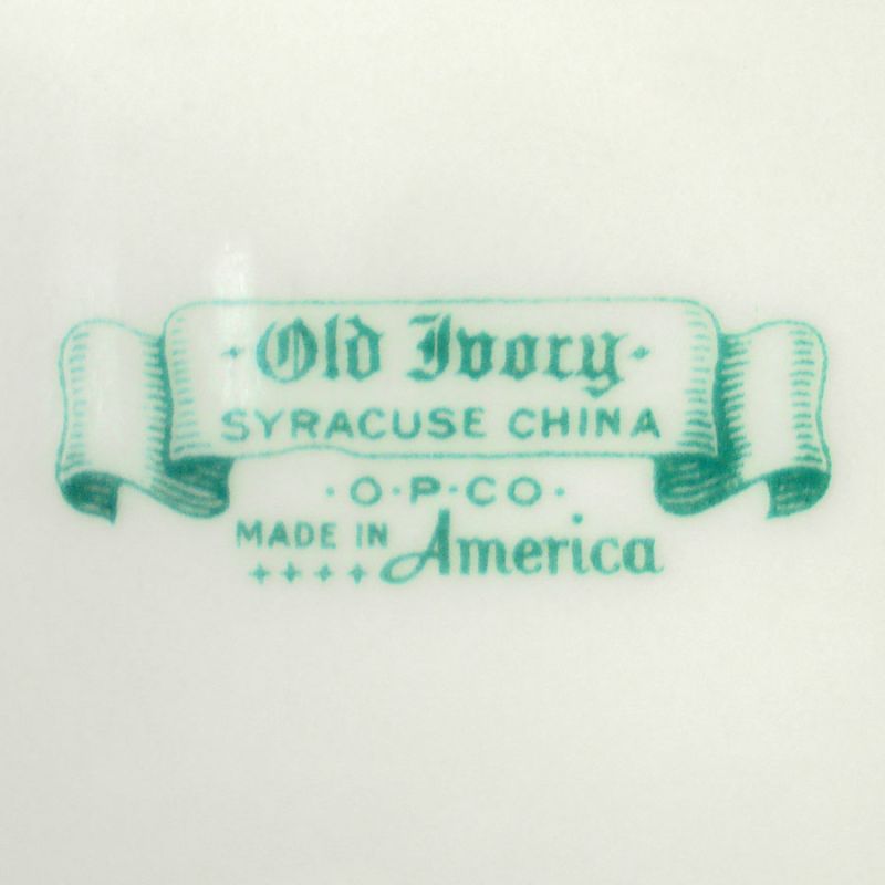 This elegant porcelain china large serving platter was made by Syracuse in the Old Ivory Nimbus Platinum pattern, introduced in 1949. The pattern was made into the 1960s, but the specific OPCO mark on the back was discontinued in the 1950s. Syracuse primarily made institutional ware, and Old Ivory was extensively used in fine hotels and restaurants.