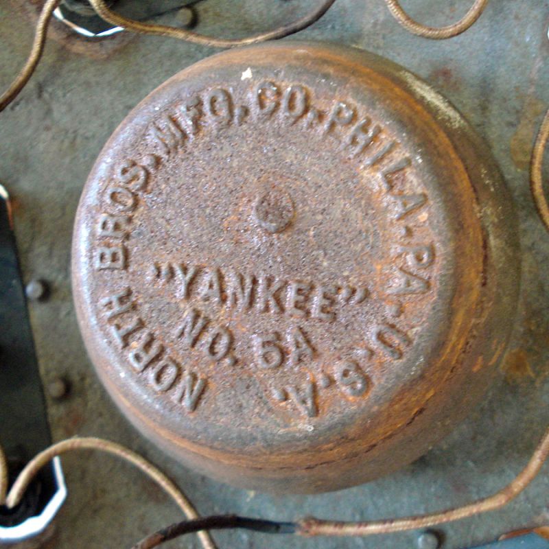 This early 1930s cast iron Christmas tree stand has its original gold paint. It's the Yankee model 5A, made by North Bros. Manufacturing Company of Philadelphia. The well column has raised skyscraper style layered spires or trees, and each of the four legs has a raised pine tree. The stand is wired to take eight C-6 Christmas light bulbs. The wiring needs repair or replacement - there are a couple of frays and splits, so the lights don't currently work. I'm including eight tested gold ribbed cone light bulbs, all working. The tree holder is about 6 inches high by 14" diameter.