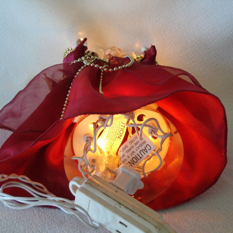This 10 inch Christmas angel lighted tree topper is mint in the original box. I removed it just once to take the pictures and and make sure it works properly. She's 10 inches high and has a porcelain head and long padded gold lamé wings. She wears a lace trimmed long deep red gown with gold glittered red chiffon overskirt. She holds a pair of miniature candle lights in her hands, which are draped with gold bead string garland to match her beaded sash. The bottom of her gown is lit by eight white miniature light bulbs. A plastic bag containing 3 replacement miniature bulbs and a fuse is attached to the light cord. The plug is the old fashioned, non polarized type so she was probably made in the 1980s. The angel lights up well as shown and is in perfect condition with no damage or wear.