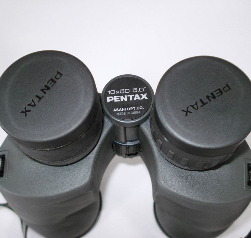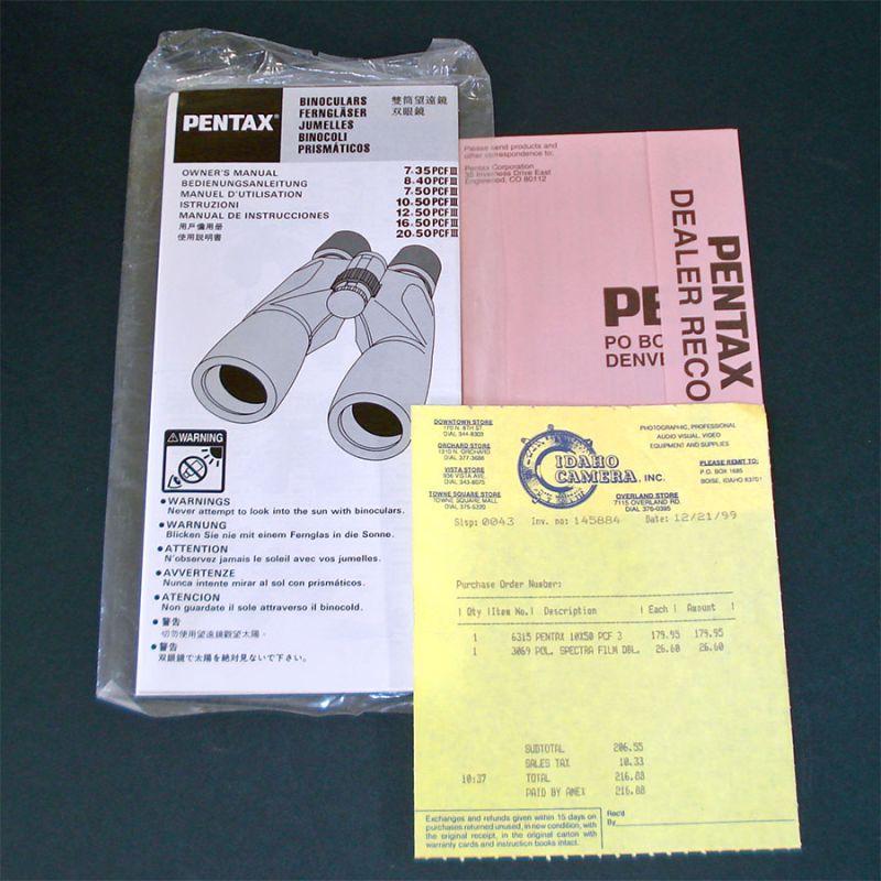 This box of Pentax PCF III binoculars was never opened until I took them out for the pictures. They were purchased by my father in law in 1999 (he paid $180 for them back then) but he never got a chance to use them. The binoculars are 10x50 and come with a soft padded case and neck strap. They're 7-1/2" high by 7 inches wide. The owners manual, dated purchase receipt, and paperwork are present. The original box has minor shelf wear but is intact. The contents are mint and unused.