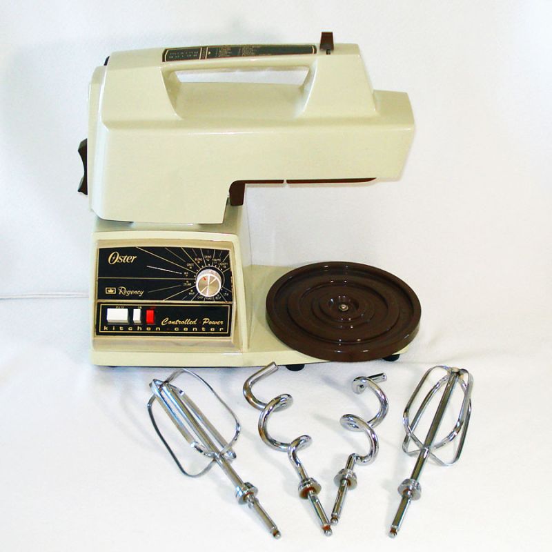 This 1982 almond color Oster Regency 12-speed kitchen center appliance is complete, missing only the original box. Included appliances and accessories are a mixer, blender, food processor, and meat grinder - all tested and working. The mixer accessories include beaters, dough hooks, and two glass mixing bowls. The blender is complete with all parts. The fourth photo shows the food processor with four different slicing/shredding blades among other components. The fifth photo shows how the meat grinder attaches to the end of the detachable mixer unit, only I forgot to turn the mixer around so that the food falls into the mixing bowl (it's designed to operate either way the mixer is turned).