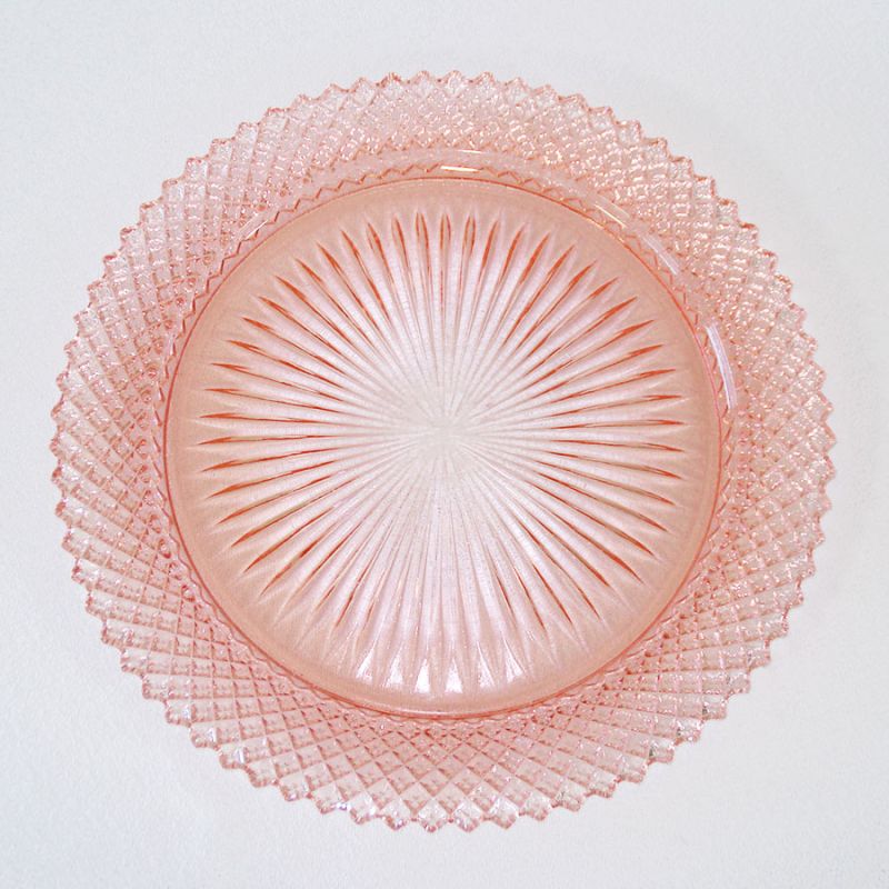 A set of six 10-1/4 inch pink depression glass dinner plates in the Miss America pattern by Anchor Hocking. All but one are in very good condition with no chips or flakes, only a few shallow utensil marks in the centers. One plate has a tiny nick to the tip of one of the edge points. Price is for the set of six plates.